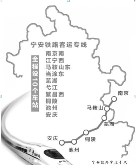寧安城際鐵路又稱寧安高鐵,線路由南京南站至安慶站,全長(zhǎng)257公里,途徑江蘇安徽兩省六市,被譽(yù)為“中國(guó)最詩(shī)意的高鐵”。鐵路由南京南站引出,經(jīng)江寧西站、馬鞍山東站、當(dāng)涂東站、蕪湖新火車站、弋江站、繁昌西站、銅陵站、池州站、,跨安慶長(zhǎng)江鐵路大橋后抵達(dá)鐵路安慶站,設(shè)計(jì)速度250公里/小時(shí)。