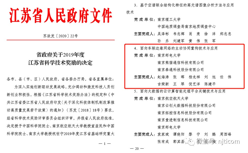 近日,江蘇省人民政府發(fā)布《關(guān)于2019年度江蘇省科學(xué)技術(shù)獎勵的決定》(蘇政發(fā)〔2020〕22號),泰通科技參與的“面向車聯(lián)邊緣網(wǎng)絡(luò)的主動協(xié)同重構(gòu)技術(shù)與應(yīng)用”項目獲得江蘇省2019年度科學(xué)技術(shù)獎二等獎,董事長吉榮新、總工程師陳建平為本項目的主要完成人,這是我公司首次在軌道交通與物聯(lián)網(wǎng)領(lǐng)域獲得的省部級二等獎。