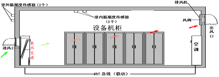 工作原理:模塊新風空調(diào)設(shè)備是結(jié)合新風與空調(diào)控制,對機房進行熱功控制的系統(tǒng),當室內(nèi)溫度達到22℃(可設(shè)置),室內(nèi)外溫度差△T≥2℃,模塊新風設(shè)備開啟,向室內(nèi)送入過濾后的冷空氣,室內(nèi)溫度降至18 ℃時,模塊新風停機;如室內(nèi)溫度繼續(xù)上升至25 ℃時,模塊新風停機,模塊精密空調(diào)啟動制冷工作,室內(nèi)溫度降至23 ℃時,模塊精密空調(diào)停止工作,等待下一個工作流程,以此循環(huán)工作。